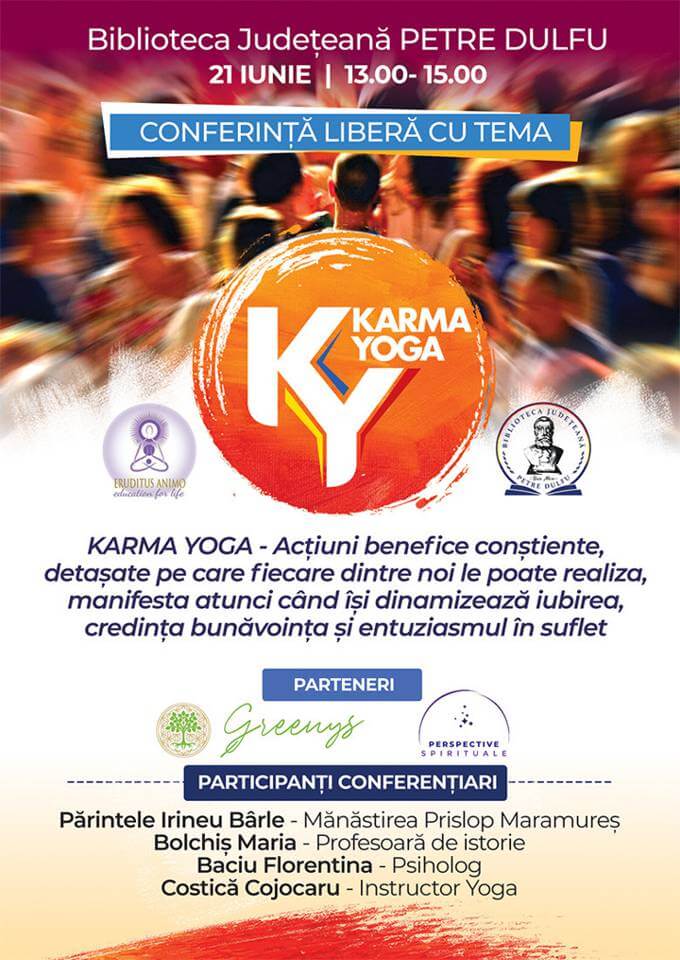Asociația „Eruditus animo” organizează conferința cu tema „Karma Yoga”- acțiuni benefice conștiente, detașate, pe care fiecare dintre noi le poate realiza, atunci când își dinamizează iubirea, credința, bunăvoința și entuziasmul în suflet.