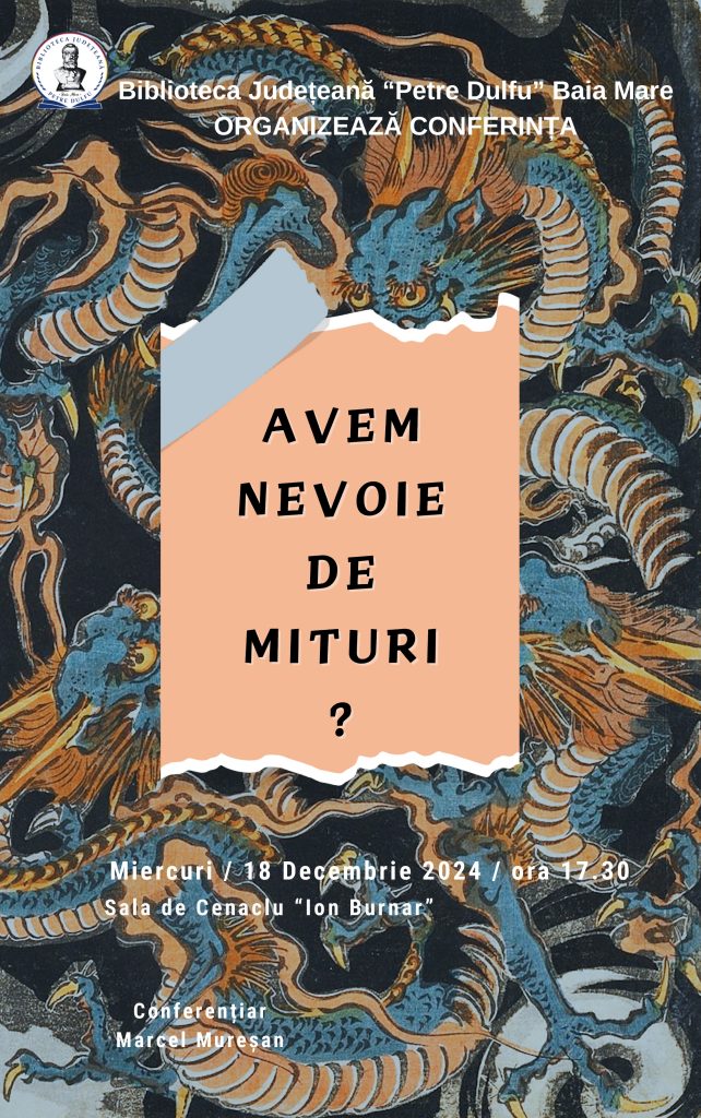Biblioteca Județeană „Petre Dulfu” organizează a paisprezecea întâlnire în cadrul conferinței „Provocările gândirii”, cu tema „Avem nevoie de mituri?”.