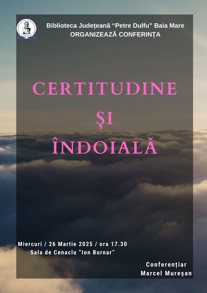 Biblioteca Județeană „Petre Dulfu” Baia Mare organizează o nouă întâlnire în cadrul seriei de conferințe „Provocările gândirii”, cu tema „Certitudine și îndoială”, susținută de Marcel Mureșan.