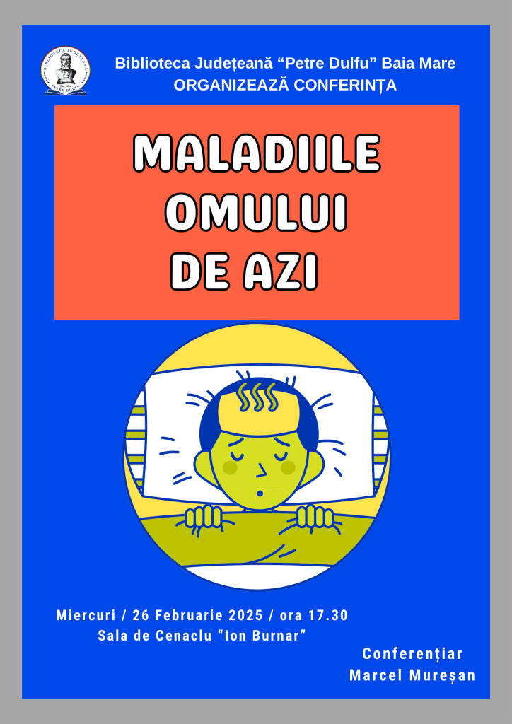 Biblioteca Județeană „Petre Dulfu” organizează o nouă întâlnire în cadrul seriei de conferințe cu titlul „Provocările gândirii”, cu tema „Maladiile omului de azi”.