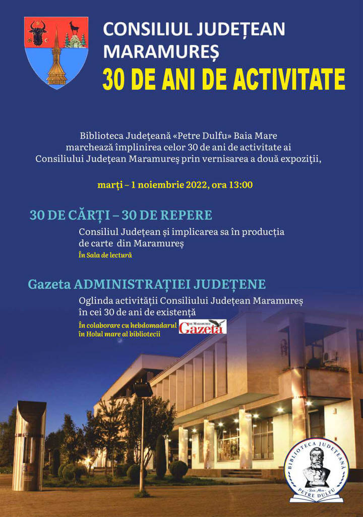 Biblioteca Județeană «Petre Dulfu» Baia Mare marchează împlinirea celor 30 de ani de activitate ai Consiliului Județean Maramureș prin vernisarea a două expoziții, marți – 1 noiembrie 2022, ora 13:00: