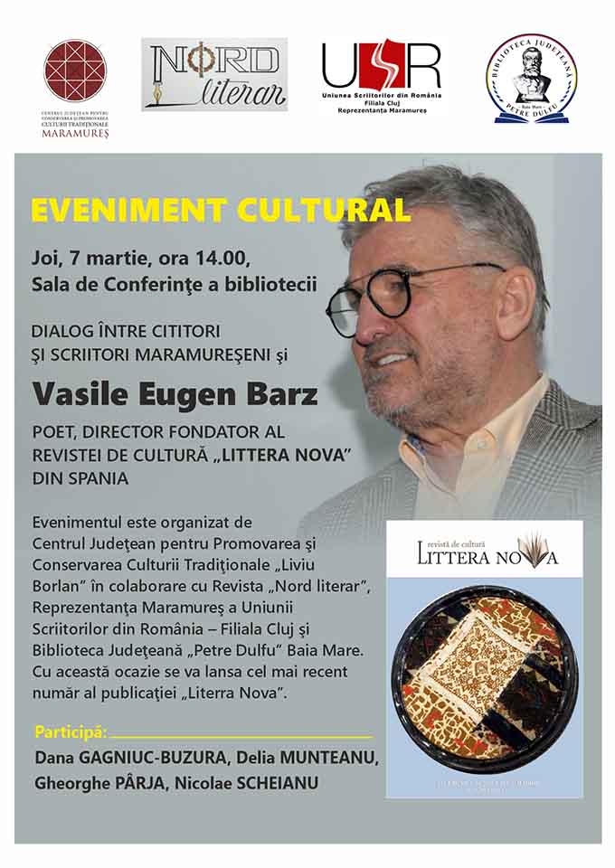 Centrul Județean pentru Promovarea și Conservarea Culturii Tradiționale „Liviu Borlan” în colaborare cu Revista „Nord literar”, Reprezentanța Maramureș a Uniunii Scriitorilor din România – Filiala Cluj și Biblioteca Județeană „Petre Dulfu” Baia Mare organizează un dialog între cititori și scriitori din Maramureș și Vasile Eugen Barz, director fondator al revistei de cultură din diaspora „Littera Nova”, ocazie cu care se va lansa cel mai recent număr al publicației.