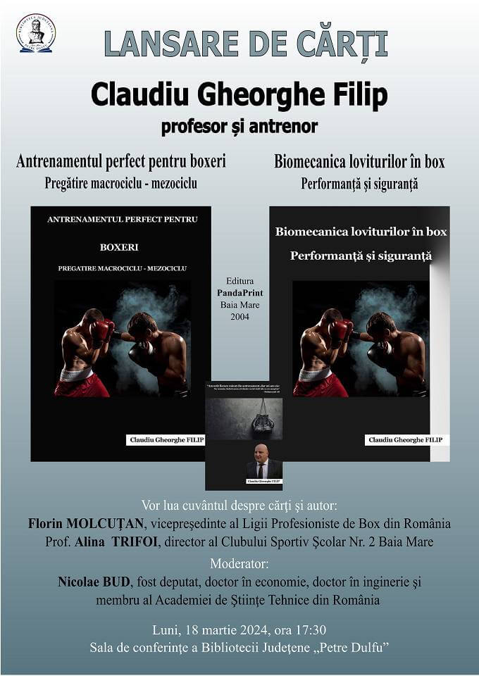 Biblioteca Județeană „Petre Dulfu” Baia Mare organizează o dublă lansare de carte din domeniul sportului, ambele volume fiind semnate de profesor antrenor Claudiu Gheorghe Filip, apărute la Editura Pandaprint, Baia Mare, 2024. Titlurile sunt: „Antrenamentul perfect pentru boxeri. Pregătire macrociclu – mezociclu” și „Biomecanica loviturilor în box. Performanță și siguranță”.