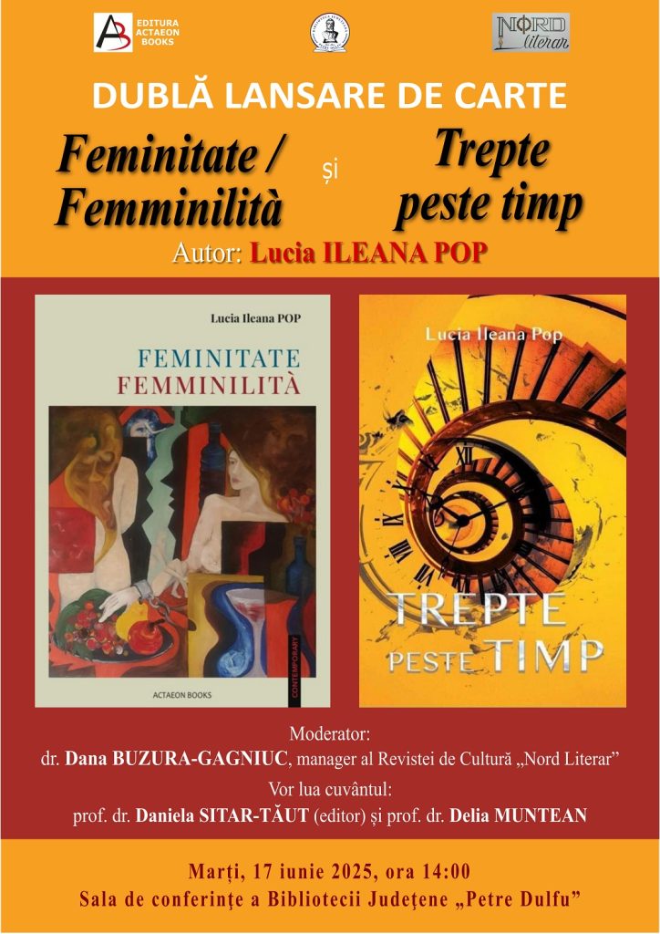 Editura Acteon Books în colaborare cu Biblioteca Judeţeană „Petre Dulfu” și Revista de Cultură „Nord Literar” organizează o dublă lansare de volume de poezii, unul bilingv „Feminitate/Femminilità”, și „Trepte peste timp”, autoare Lucia Ileana Pop, cărți apărute la Editura Acteon Books, Baia Mare, 2025, respectiv Timpul, Iași, 2023.
