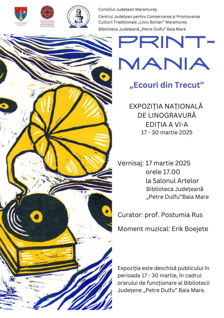 Sub egida Consiliului Județean Maramureș, Centrul Județean pentru Conservarea și Promovarea Culturii Tradiționale „Liviu Borlan” Maramureș în colaborare cu Biblioteca Județeană „Petre Dulfu” Baia Mare organizează expoziția națională de linogravură „Printmania”, ediția a VI-a intitulată „Ecouri din trecut”.