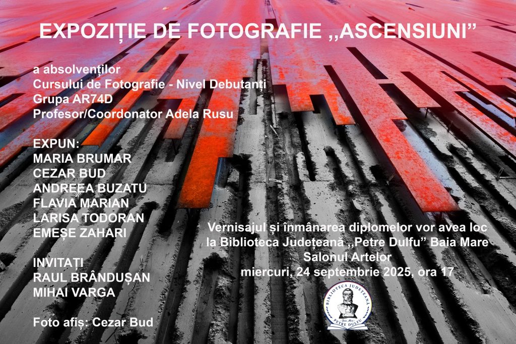 Biblioteca Județeană ”Petre Dulfu” Baia Mare în colaborare cu Varadinum Photo School organizează vernisajul expoziţiei de fotografie intitulate „Ascensiuni” a absolvenților Cursului de Fotografie (AR74D – Nivel-Debutanți) de la Baia Mare). Adela Rusu – Lector/coordonator.