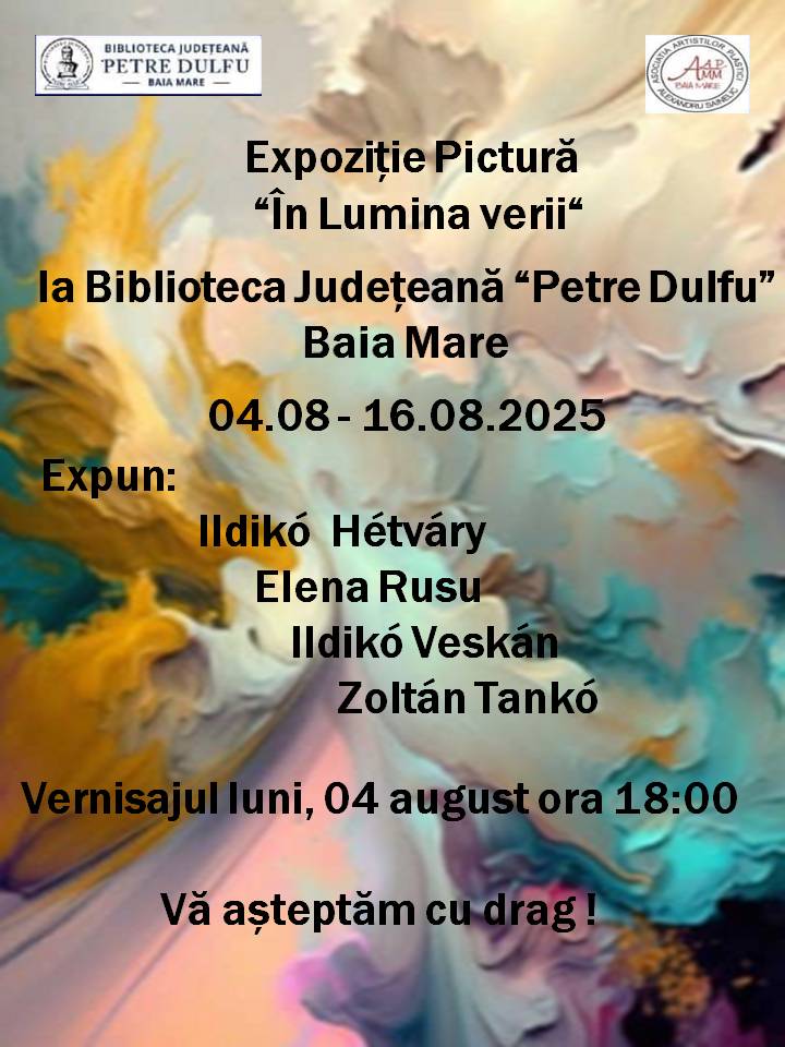 Biblioteca Judeţeană „Petre Dulfu” în colaborare cu Asociația Artiștilor Plastici „Alexandru Șainelic” Baia Mare organizează vernisajul expoziției „În lumina verii”. Expoziția poate fi vizitată la Salonul Artelor în perioada 4 – 17 august 2025.