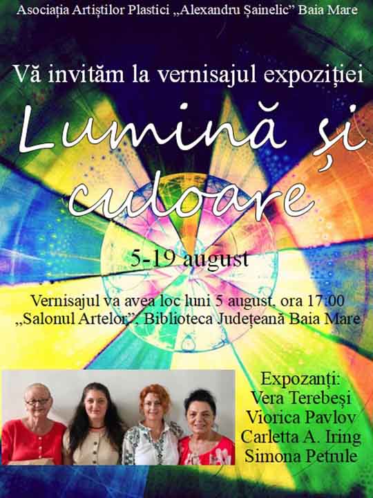 Asociația Artiștilor Plastici „Alexandru Șainelic” Maramureș în colaborare cu Biblioteca Județeană „Petre Dulfu” Baia Mare organizează vernisajul expoziției de pictură de grup intitulată „Lumină și culoare”, a membrilor AAP „Alexandru Șainelic”.