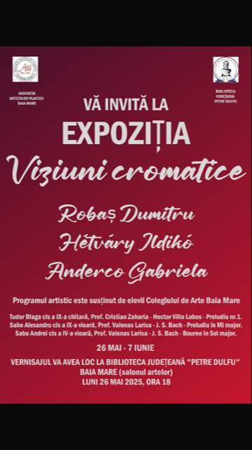 Biblioteca Județeană „Petre Dulfu” în parteneriat cu Asociația Artiștilor Plastici „Alexandru Șainelic” organizează vernisajul expoziției de pictură intitulată „Viziuni cromatice” a membrilor asociației. Expoziția va putea fi vizitată la Salonul Artelor în perioada 26 mai – 7 iunie.