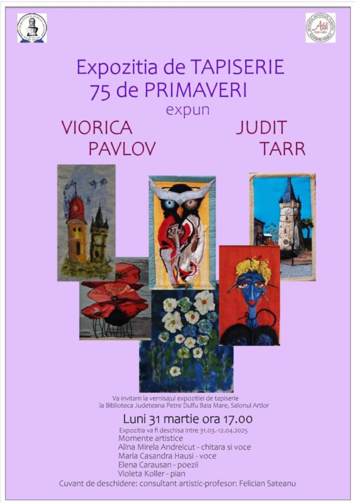 Asociația Artiștilor Plastici „Alexandru Șainelic” în colaborare cu Biblioteca Județeană „Petre Dulfu” organizează vernisajul expoziției de tapiserie intitulată „75 de primăveri” a artistelor plastice Viorica Pavlov și Judit Tarr. Expoziția va putea fi vizitată la Salonul Artelor în perioada 31 martie – 14 aprilie 2025.