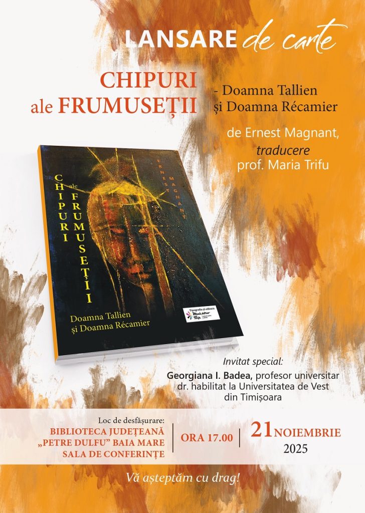 Biblioteca Județeană „Petre Dulfu” Baia Mare organizează lansarea cărții „Chipurile frumuseții – Doamna Tallien și Doamna Récamier”, de Ernest Magnant, traducere de prof. Maria Trifu, volum apărut la Editura MaestroTip, Fersig, 2025.