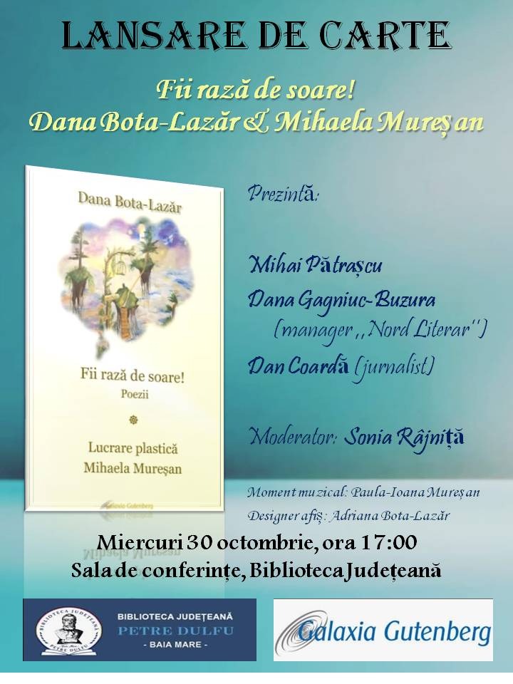 Biblioteca Județeană „Petre Dulfu” Baia Mare în colaborare cu Editura Galaxia Gutenberg Târgu Lăpuș organizează lansarea volumului de poezii „Fii rază de soare!”, de Dana Bota-Lazăr, volum ilustrat de Mihaela Mureșan, apărut la Galaxia Gutenberg, Târgu Lăpuș, 2024.