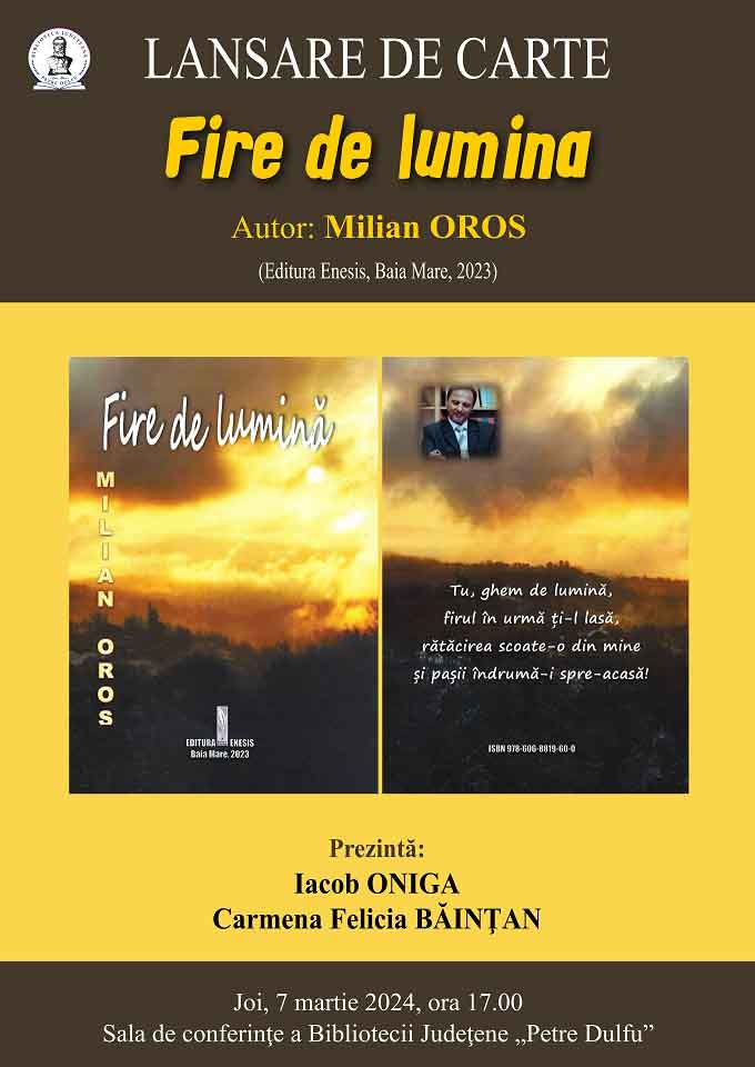 Biblioteca Județeană „Petre Dulfu” Baia Mare organizează lansarea volumului „Fire de lumină”, autor Milian Oros.