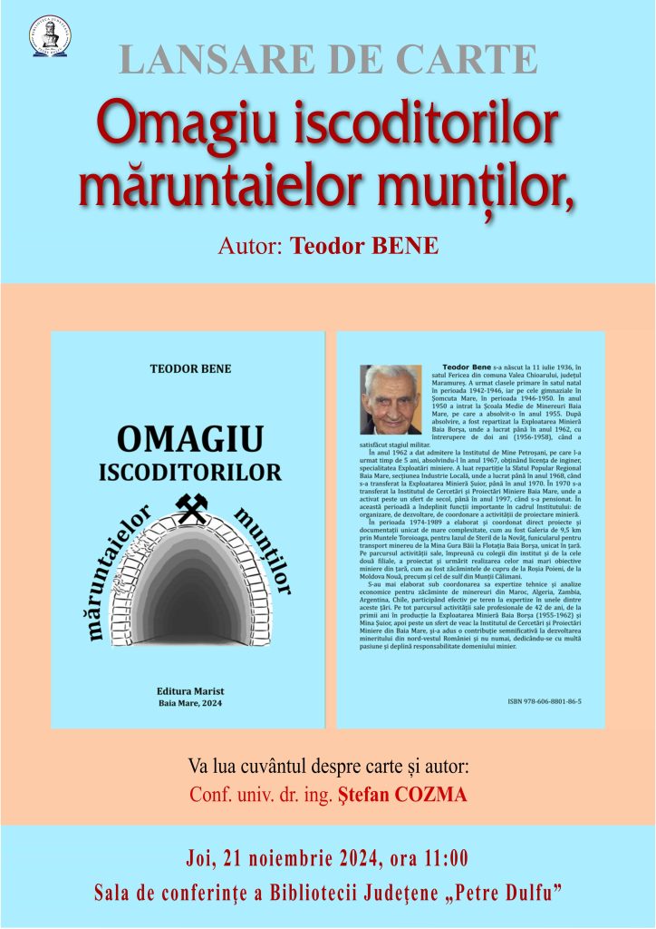 Biblioteca Județeană „Petre Dulfu” Baia Mare organizează lansarea volumului „Omagiu iscoditorilor măruntaielor munților”, autor ing. Teodor Bene, volum apărut la Editura Marist, Baia Mare, 2024.