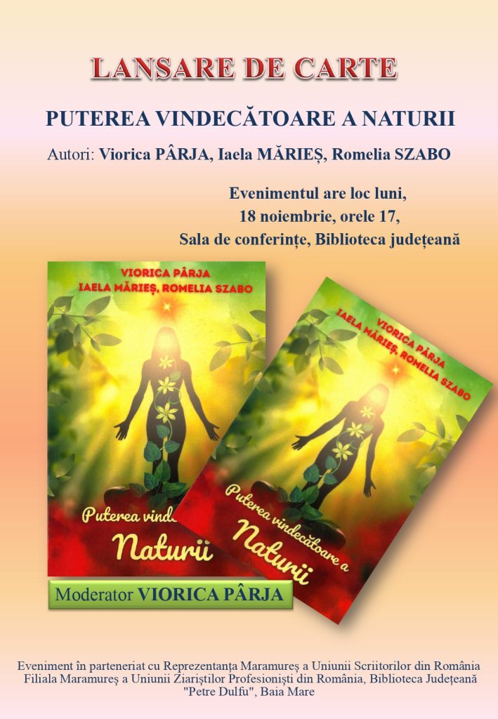 Va avea loc lansarea volumului „Puterea vindecătoare a naturii”, autoare Viorica Pârja, Iaela Mărieș, Romelia Szabo. Evenimentul este organizat în parteneriat de Reprezentanța Maramureș a Uniunii Scriitorilor din România, Filiala Maramureș a Uniunii Ziariștilor Profesioniști din România și Biblioteca Județeană „Petre Dulfu” Baia Mare.