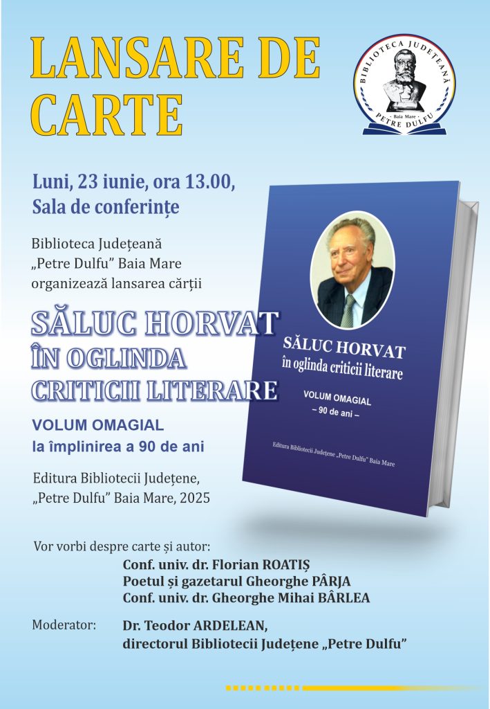 Biblioteca Judeţeană „Petre Dulfu” organizează lansarea cărții „Săluc Horvat în oglinda criticii literare”, volum omagial la împlinirea a 90 de ani de viață, apărut la Editura Bibliotecii Județene „Petre Dulfu” Baia Mare, 2025.