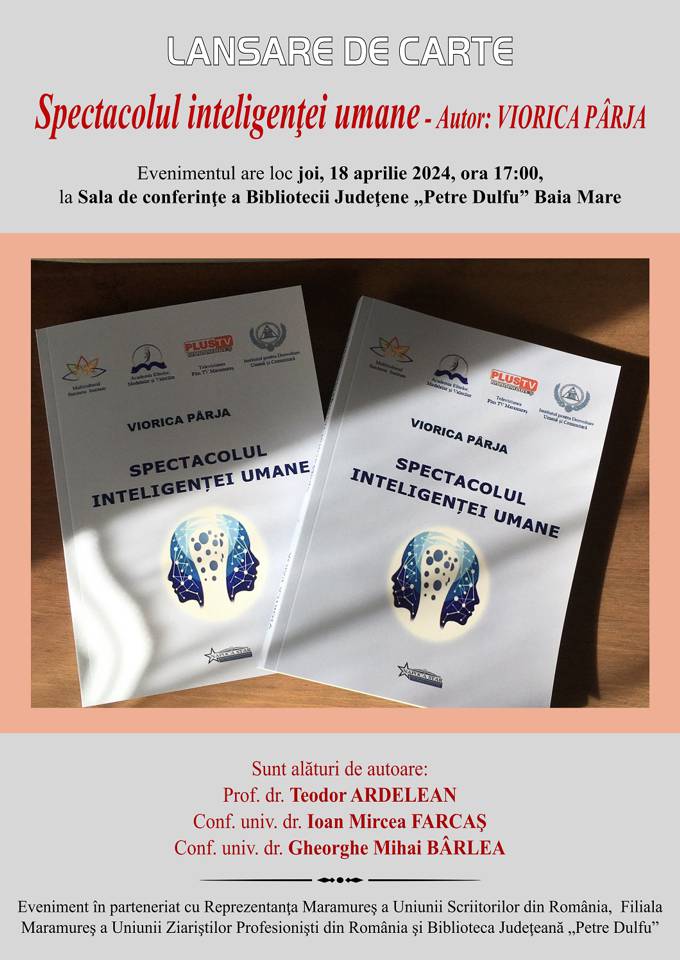 Va avea loc lansarea cărții „Spectacolul inteligenței umane”, autoare Viorica Pârja, apărută la Editura Napoca Star, 2024. Eveniment în parteneriat cu Reprezentanța Maramureș a Uniunii Scriitorilor din România și Filiala Maramureș a Uniunii Ziariștilor Profesioniști din România.