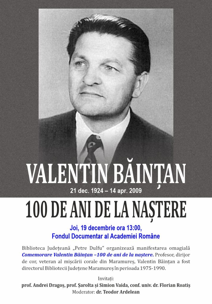 Biblioteca Județeană „Petre Dulfu” organizează manifestarea omagială „Comemorare Valentin Băințan – 100 de ani de la naștere”. Profesor, dirijor de cor, veteran al mișcării corale din Maramureș, Valentin Băințan a fost directorul Bibliotecii Județene Maramureș în perioada 1975-1990.