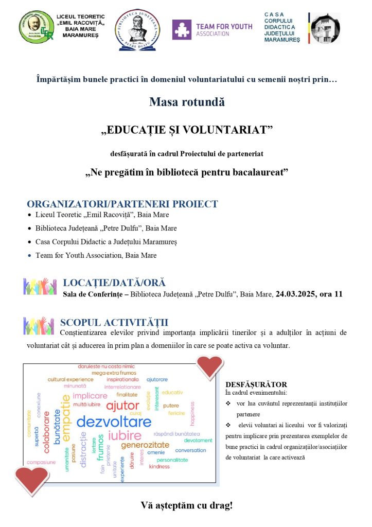 Liceul Teoretic „Emil Racoviță” Baia Mare în parteneriat cu Biblioteca Județeană „Petre Dulfu” Baia Mare, Casa Corpului Didactic Maramureș și Asociația „Team for Youth” Baia Mare organizează masa rotundă „Educație și Voluntariat”, desfășurată în cadrul proiectului „Ne pregătim în bibliotecă pentru bacalaureat”.