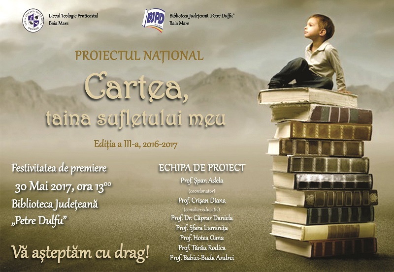 Liceul Teologic Penticostal Baia Mare în colaborare cu Biblioteca Judeţeană „Petre Dulfu” organizează festivitatea de premiere a participanţilor la proiectul naţional „Cartea, taina sufletului meu”.