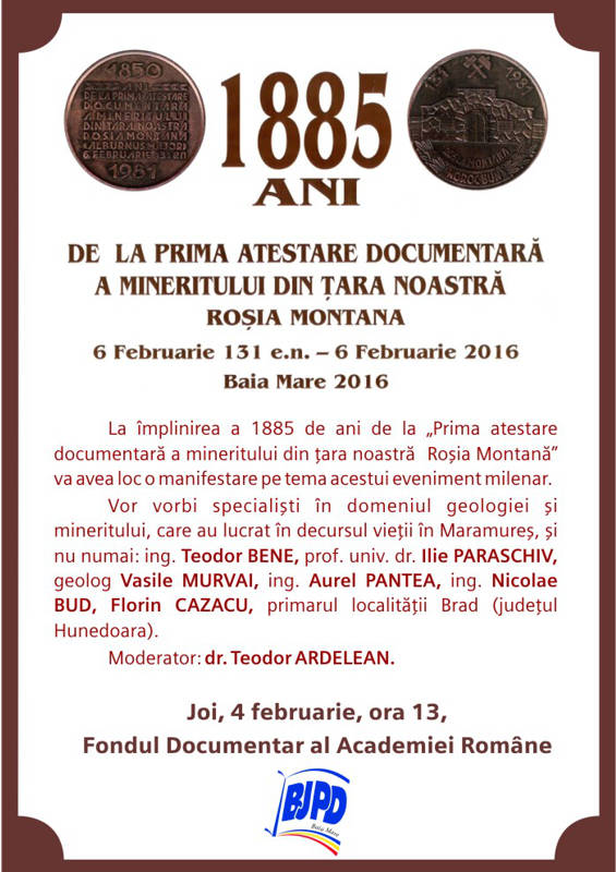 Cu ocazia împlinirii a 1885 de ani de la „Prima atestare documentară a mineritului din ţara noastră – Roşia Montană” (6 februarie 131 e.n. – 6 februarie 2016), va avea loc o manifestare pe tema acestui eveniment milenar.