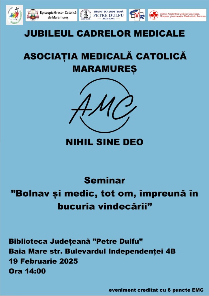Asociația Medicală Catolică în colaborare cu Episcopia Greco-Catolică Maramureș și Biblioteca Județeană „Petre Dulfu” organizează seminarul „Bolnav și medic, tot om, împreună în bucuria vindecării”.