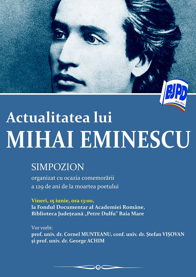 Cu ocazia comemorării a 129 de ani de la moartea poetului Mihai Eminescu, Biblioteca Judeţeană „Petre Dulfu” organizează simpozionul intitulat „Actualitatea lui Mihai Eminescu”.