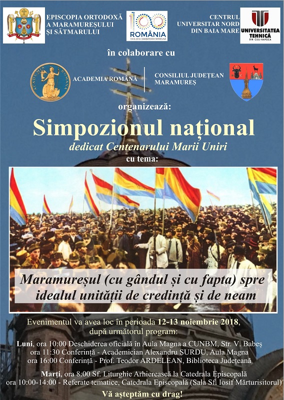 Se va desfăşura Sesiunea a II-a: „Cultură religioasă şi identitate naţională” a Simpozionului naţional dedicat Centenarului Marii Uniri cu tema: „Maramureşul (cu gândul şi cu fapta) spre idealul unităţii de credinţă şi de neam”.
