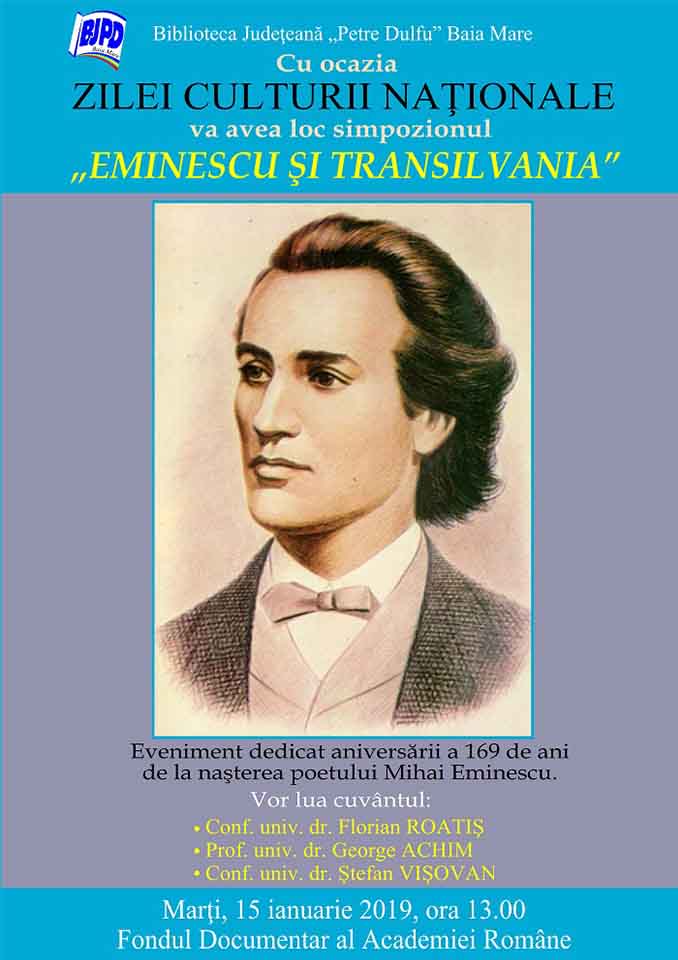 Cu ocazia Zilei Culturii Naţionale va avea loc simpozionul „Eminescu şi Transilvania”, eveniment dedicat aniversării a 169 de ani de la naşterea poetului Mihai Eminescu.