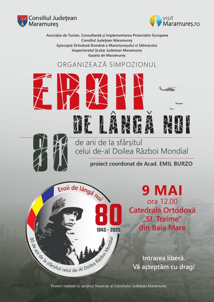 Asociația de Turism, Consultanță și Implementarea Proiectelor Europene, Consiliul Județean Maramureș, Epsicopia Ortodoxă a Maramureșului și Sătmarului, Inspectoratul Școlar Județean Maramureș și Gazeta de Maramureș organizează simpozionul „Eroii de lângă noi”- 80 de ani de la sfârșitul celui de-Al Doilea Război Mondial, proiect coordonat de academician Emil Burzo și realizat cu sprijinul financiar al Consiliului Județean Maramureș.
