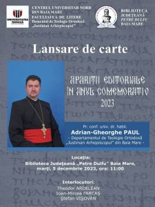 În cadrul simpozionului, la ora 11, în Sala de conferințe a Bibliotecii Județene „Petre Dulfu”, va avea loc lansarea cărții „Apariții editoriale în Anul comemorativ 2023”, autor pr. conf. univ. dr. habil. Adrian-Gheorghe Paul – Departamentul de Teologie Ortodoxă „Justinian Arhiepiscopul” din Baia Mare.