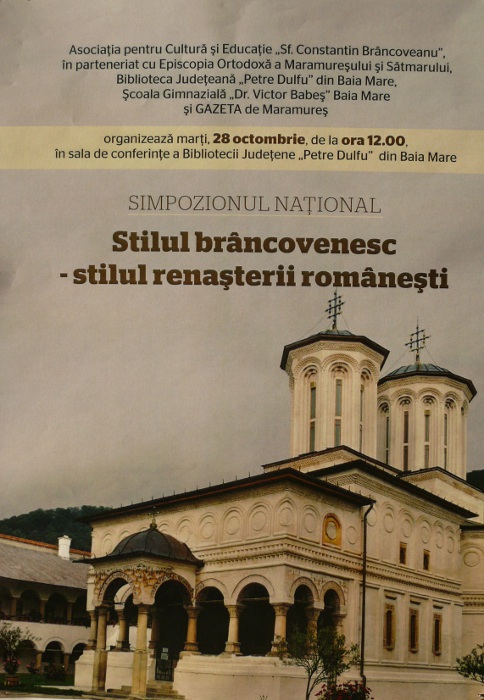Asociația pentru Cultură și Educație „Sf. Constantin Brâncoveanu” în parteneriat cu Episcopia Ortodoxă a Maramureșului și Sătmarului, Biblioteca Județeană „Petre Dulfu” Baia Mare, Școala Gimnazială „Victor Babeș” și Gazeta de Maramureș organizează simpozionul național „Stilul brâncovenesc – stilul renașterii românești„.