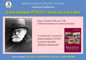 Marți, 10 martie, de la ora 13, la Fondul Documentar al Academiei Române, sub semnul patronului spiritual, Biblioteca Județeană „Petre Dulfu” organizează manifestarea „Un erudit transilvănean: Petre Dulfu. Evocare la 164 de ani de la naștere”.