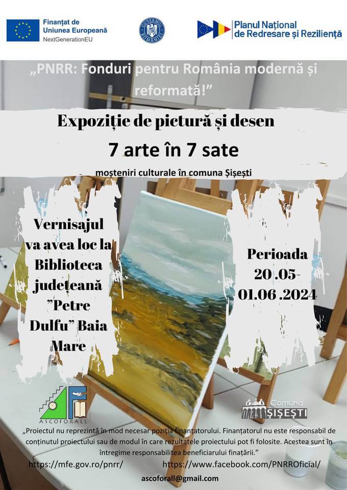 Asociația ASCO Forall Șișești în colaborare cu Biblioteca Județeană „Petre Dulfu” Baia Mare organizează vernisajul expoziției „7 arte în 7 sate – moșteniri culturale în comuna Șișești”, eveniment parte a proiectului cu același nume, finanțat prin PNRR. Această expoziție va cuprinde desene și picturi cu tematică cultural-rurală, realizate de copiii beneficiari ai proiectului și va putea fi vizitată până la data de 1 iunie.
