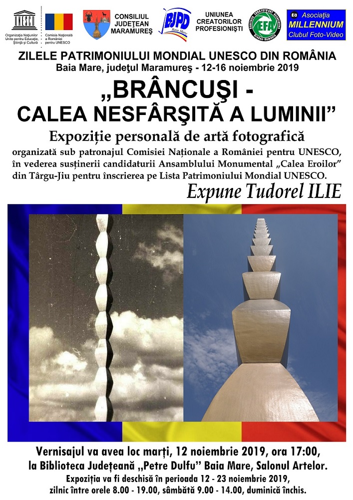 - ora 17:30, vernisajul expoziției personale de artă fotografică autor Ilie Tudorel cu titlul “Brâncuși – Calea nesfârșită a luminii”.