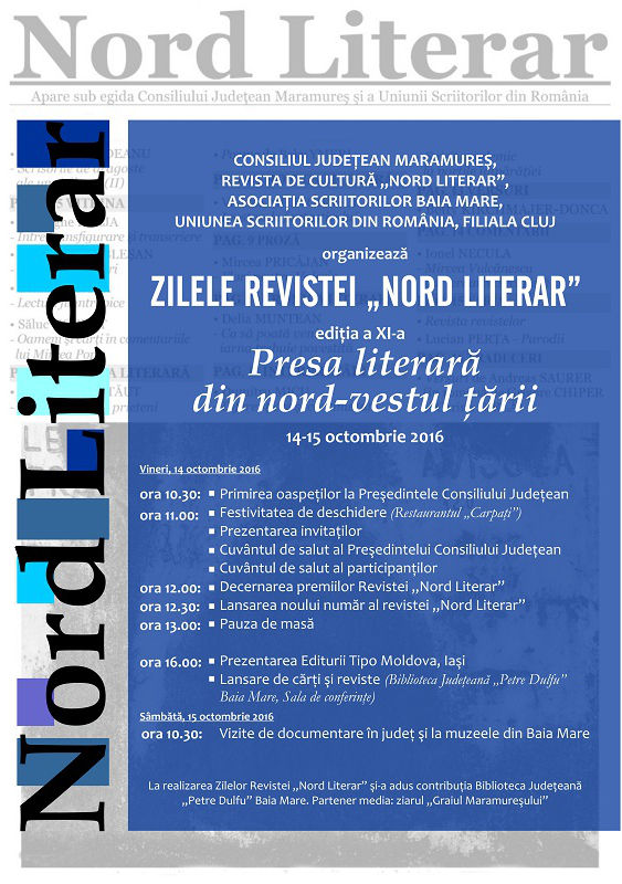 Consiliul Judeţean Maramureş, Revista de Cultură „Nord Literar”, Asociaţia Scriitorilor Baia Mare, Uniunea Scriitorilor din România, Filiala Cluj organizează „Zilele revistei ”Nord literar” ediţia a XI-a – „Presa literară din nord-vestul ţării„, 14 – 15 octombrie 2016.