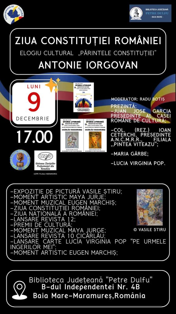 Cu ocazia Zilei Constituției României, va avea loc o manifestare organizată în parteneriat de Casa de Cultură Română Getafe (Spania) cu Biblioteca Județeană „Petre Dulfu” Baia Mare.