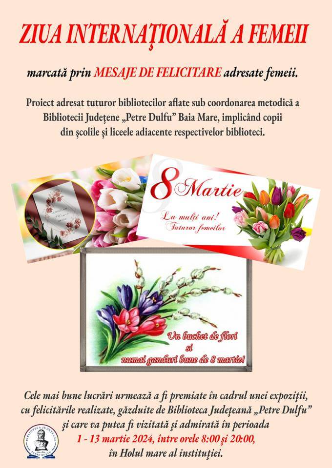 Biblioteca Județeană „Petre Dulfu” marchează Ziua Internațională a Femeii prin mesaje de felicitare adresate femeilor, în ipostazele ei de mamă, soție, soră, prietenă etc.