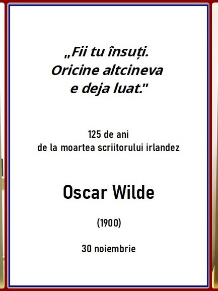 „Fii tu însuți. Oricine altcineva e deja luat.” – 125 de ani de la moartea scriitorului irlandez Oscar Wilde (1900) – vitrină de carte realizată la Compartimentul Multiculturalia   Oscar Fingal O’Flaherty Wills Wilde (n. 16 octombrie 1854, Baile Átha Cliath, Regatul Unit al Marii Britanii și Irlandei – d. 30 noiembrie 1900, Paris, Franța)…