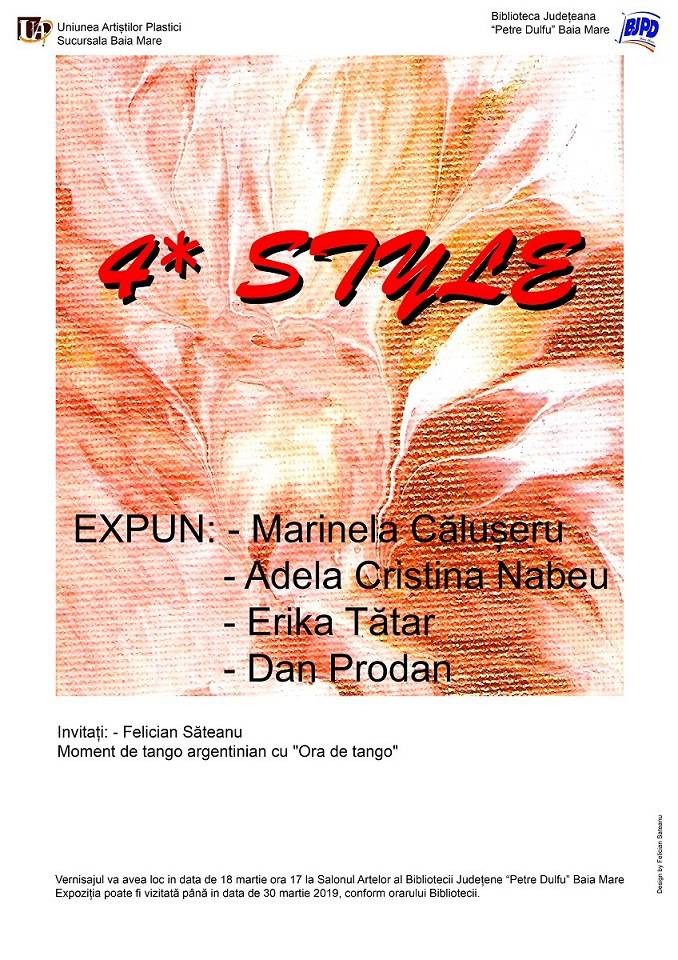 Va avea loc vernisajul expoziţiei de pictură de grup intitulată „4*style” a membrilor Uniunii Artiştilor Plastici – sucursala Baia Mare. Expoziţia va putea fi vizitată în perioada 18-30 martie 2019, la Salonul Artelor, conform programului bibliotecii.