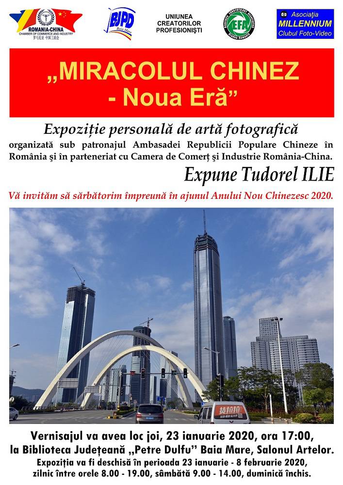 Va avea loc vernisajul expoziției personale de artă fotografică intitulate “Miracolul chinez – Noua Eră”, organizate sub patronajul Ambasadei Republicii Populare Chineze în România și în parteneriat cu Camera de Comerț și Industrie România-China.