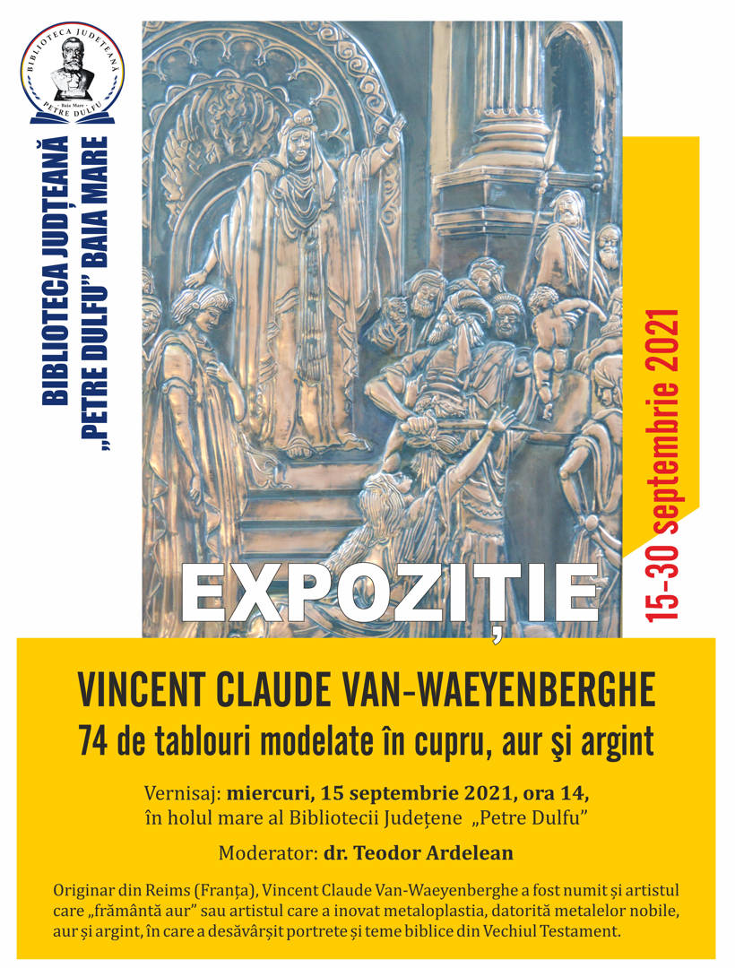 Vincent Claude Van-Waeyenberghe revine la Baia Mare cu o amplă expoziție de 74 de tablouri modelate în cupru, aur și argint. Vernisajul expoziției va avea loc miercuri 15 septembrie 2021, ora 14.00 în holul mare al Bibliotecii Județene „Petre Dulfu” Baia Mare și va fi deschisă pentru public până pe 30 septembrie 2021.