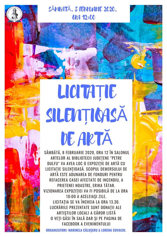 Sâmbătă, 8 februarie, de la ora 12, în Salonul Artelor al Bibliotecii Județene „Petre Dulfu” va avea loc o expoziție de artă cu licitație silențioasă, având ca scop adunarea de fonduri pentru refacerea casei afectate de incendiu, a prietenei noastre, Erika Tătar.