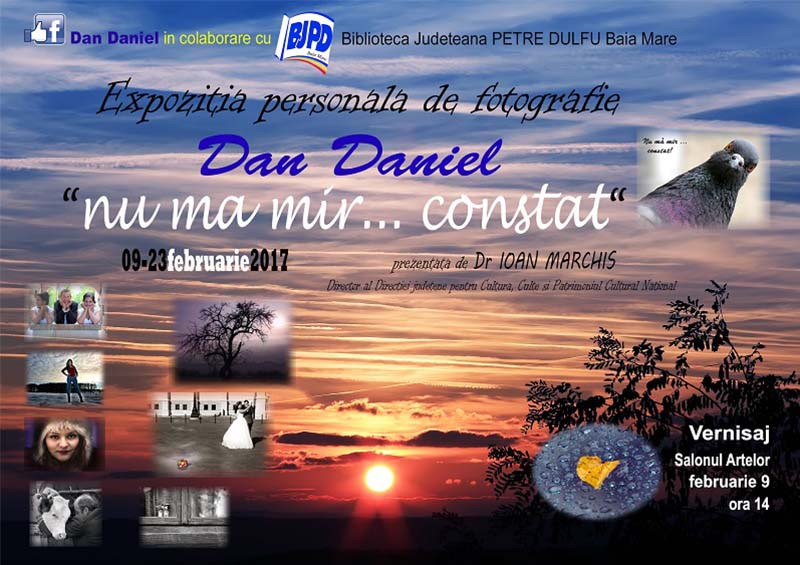 Va avea loc vernisajul expoziţiei personale de fotografie intitulată „nu mă mir… constat” a fotografului Dan Daniel, organizată în colaborare cu Biblioteca Judeţeană „Petre Dulfu”.