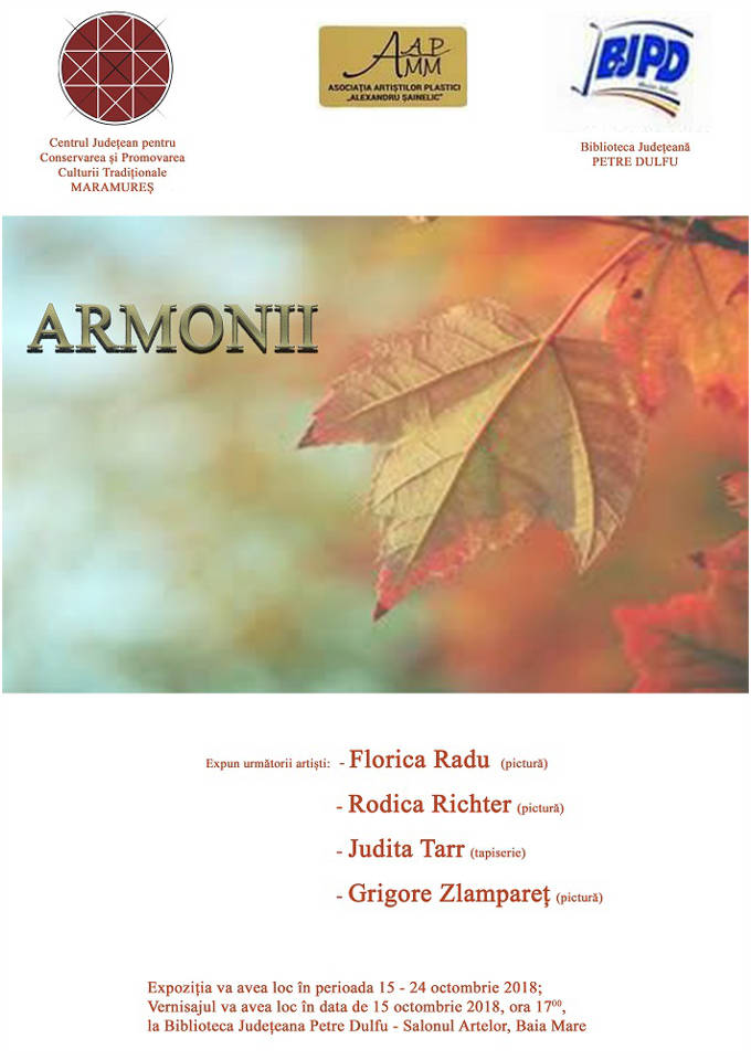 Va avea loc vernisajul expoziţiei de grup intitulată „Armonii”, a membrilor Asociaţiei Artiştilor Plastici „Alexandru Şainelic”. Evenimentul este organizat în colaborare cu Biblioteca Judeţeană „Petre Dulfu” şi Centrul Judeţean pentru Conservarea şi Promovarea Culturii Tradiţionale Maramureş.