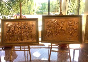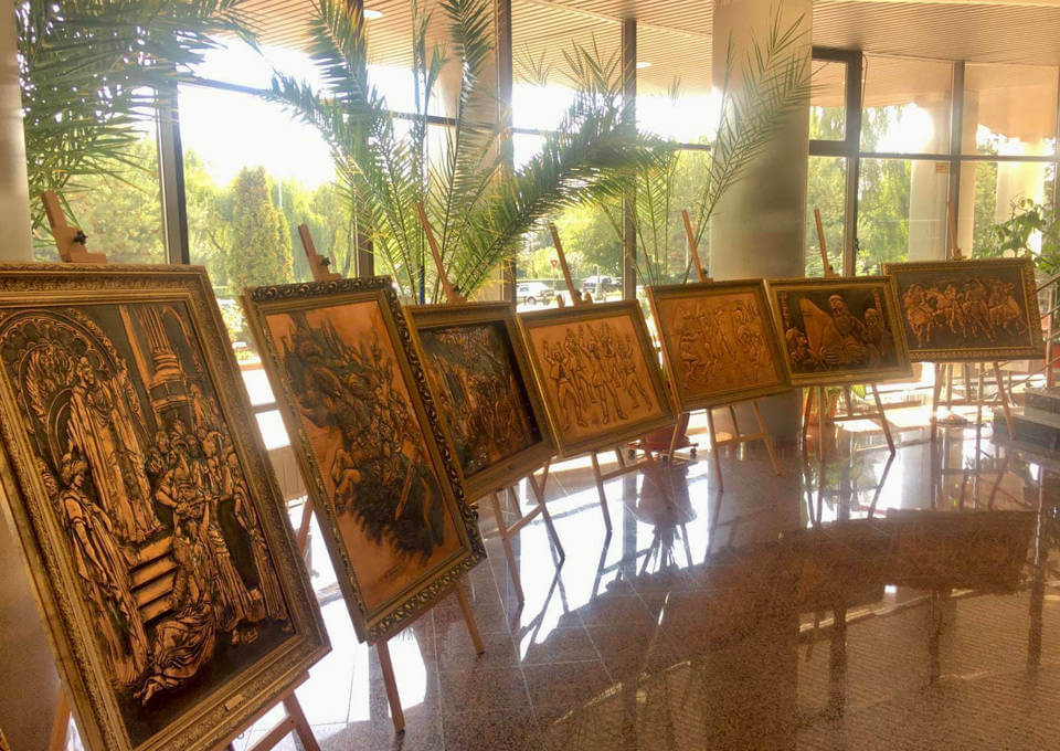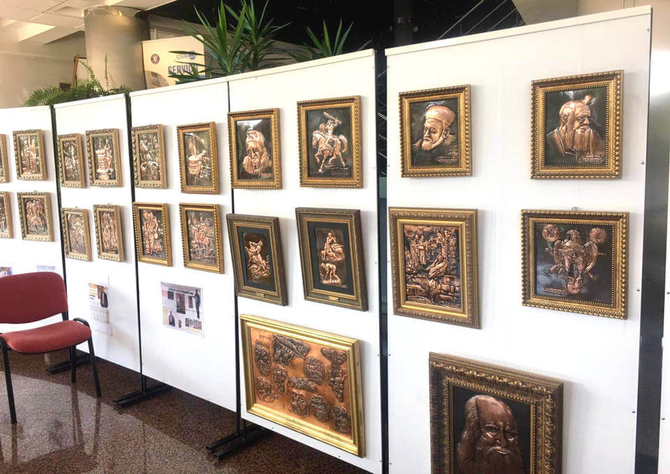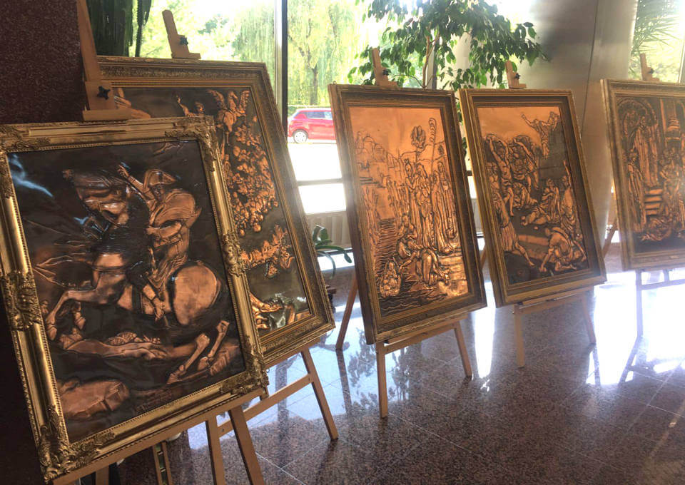 Artistul, care se află la a treia participare pe simezele bibliotecii județene, a adus din nou la Baia Mare lucrări modelate în cupru, aur și argint, precum și un sul de pânză de 42 de metri înfățișând scene și personaje biblice.