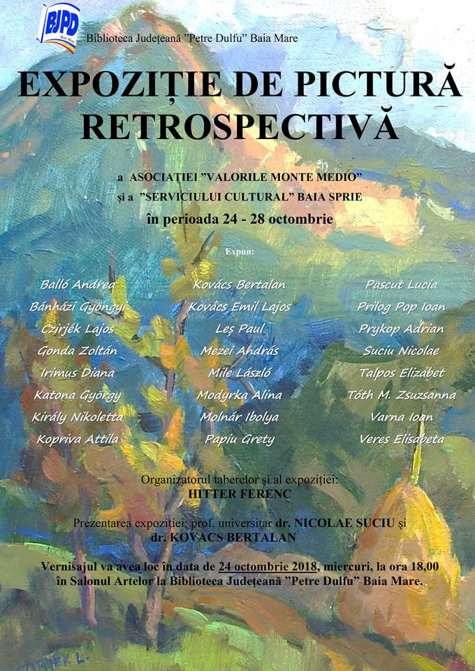 Asociaţia „Valorile Monte Medio” în colaborare cu „Serviciul Cultural” Baia Sprie şi Biblioteca Judeţeană „Petre Dulfu” organizează vernisajul expoziţiei de pictură de grup intitulată „Retrospectivă”. Taberele de pictură şi expoziţia au fost organizate de: Hitter Ferenc.