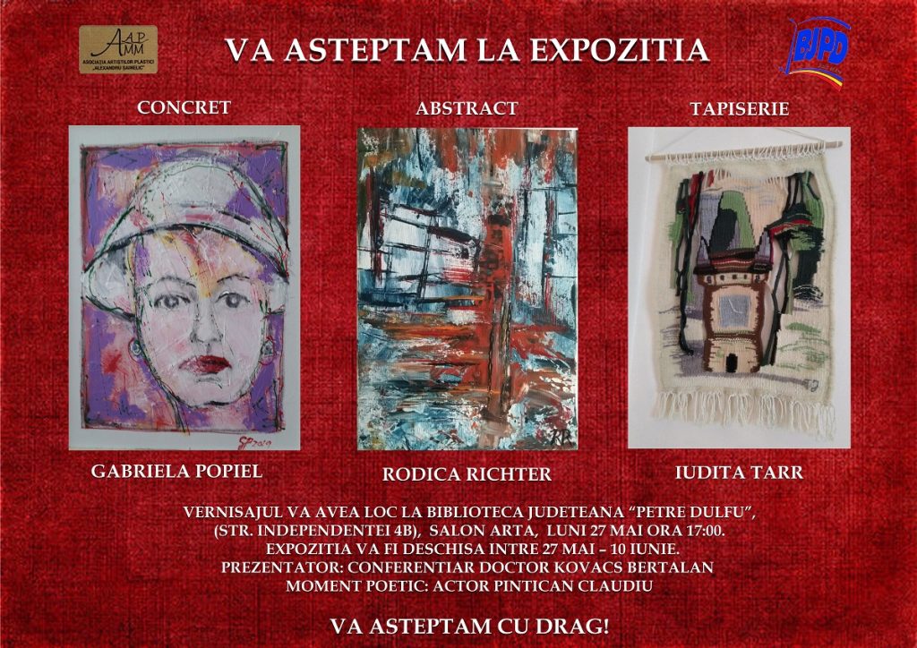 Va avea loc vernisajul expoziţiei de pictură şi tapiserie a artistelor plastice Gabriela Popiel, Rodica Richter şi Iudita Tarr. Expoziţia va putea fi vizitată la Salonul Artelor, în perioada 27 mai – 10 iunie 2019, conform programului bibliotecii.