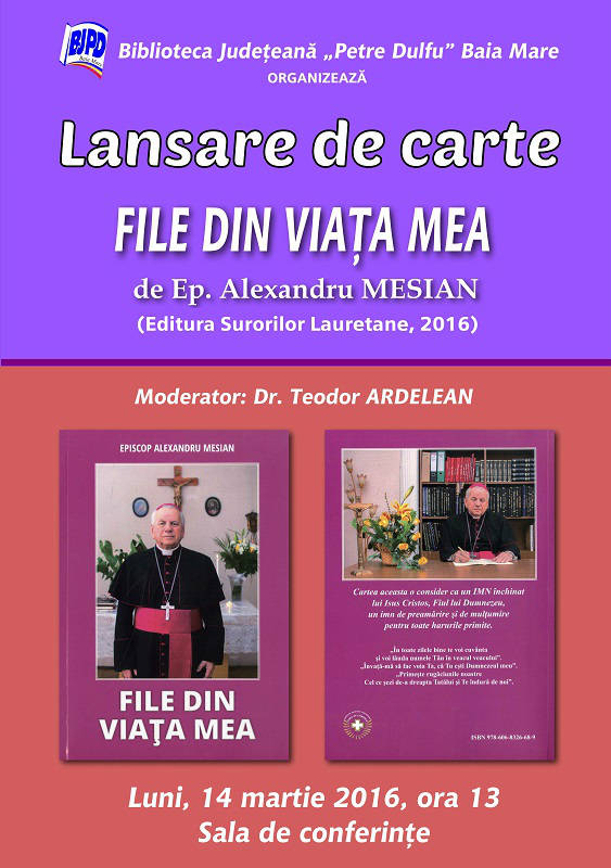 Va avea loc lansarea cărţii „File din viaţa mea”, autor Ep. Alexandru Mesian, apărută la Editura Surorilor Lauretane, 2015.