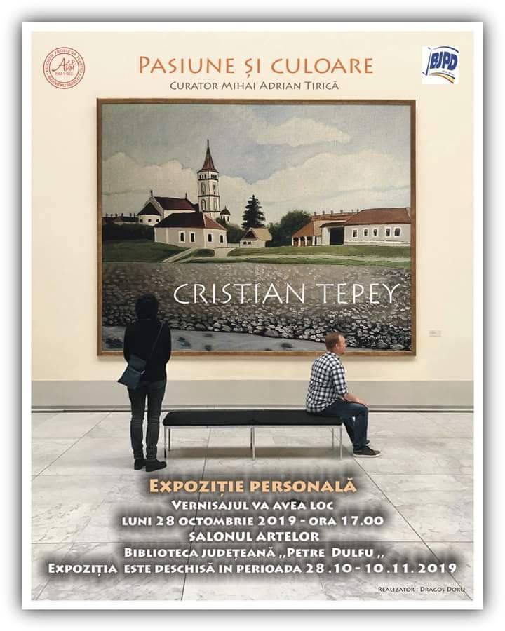 Asociația Artiștilor Plastici “Alexandru Șainelic” în colaborare cu Biblioteca Județeană “Petre Dulfu” organizează vernisajul expoziției personale de pictură intitulate “Pasiune și culoare”, autor: Cristian Tepey.